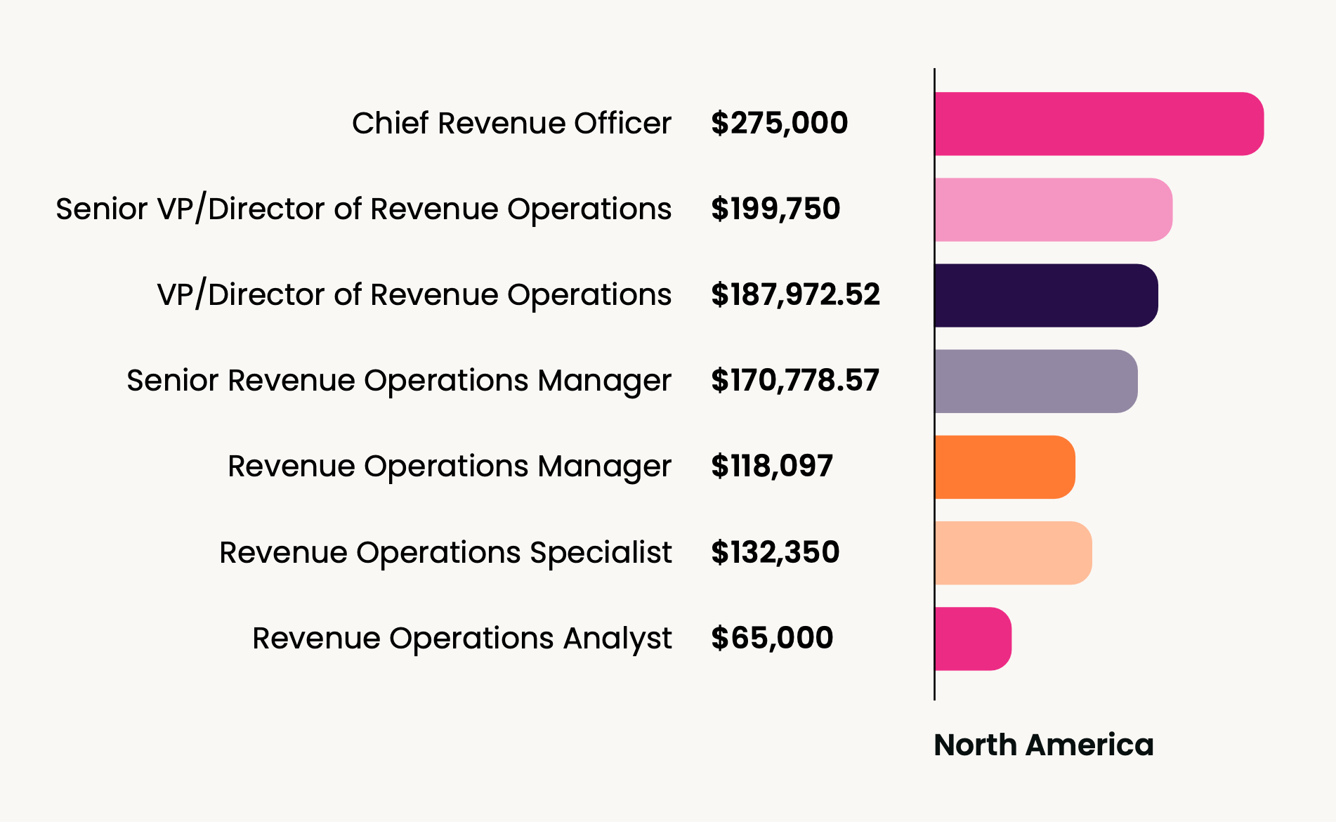 It's clear from our data that North America leads the pack when it comes to RevOps salaries. This isn't particularly surprising, given that the RevOps function originated and matured fastest in this region.
