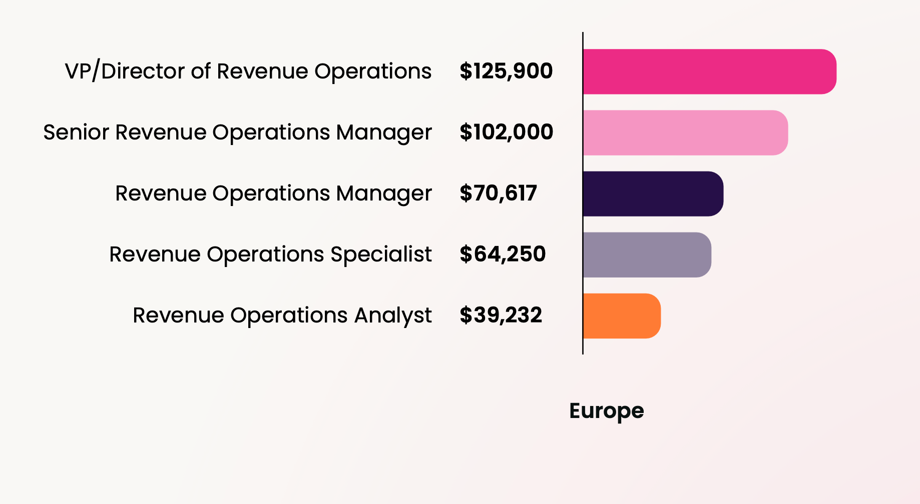 In Europe and other parts of the world where RevOps is still gaining traction, salaries may be lower due to less competition for talent. However, as these markets mature and more companies recognize the value of RevOps, we can expect to see salaries increase.