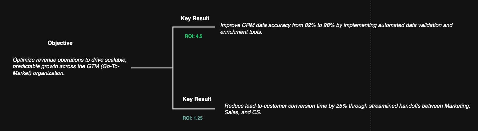 High-level objectives are set at the company level and cascaded down to business units and individual teams that measure key results (KRs) tied to those objectives. Here’s a RevOps example:
